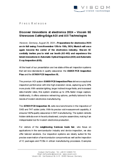 Hanover, Germany, August 29, 2024 – Preparations for electronica 2024 are in full swing. From November 12th to 15th, 2024, Munich will once again become the center of the electronics industry. Viscom SE cordially invites you to visit our booth (A3-443) and experience the latest innovations in Automatic Optical Inspection (AOI) and Automatic X-ray Inspection (AXI).