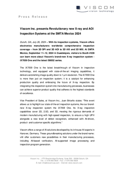Duluth, GA, July 26, 2024 – With its inspection systems, Viscom offers electronics manufacturers worldwide comprehensive inspection coverage – from 3D SPI and 3D AOI to 3D AXI and 3D MXI. At SMTA Mexico, September 11–12, 2024 in Guadalajara, visitors to Booth #539 can learn more about Viscom's brand-new X-ray inspection system - iX7059 One and the latest iS6052 series.