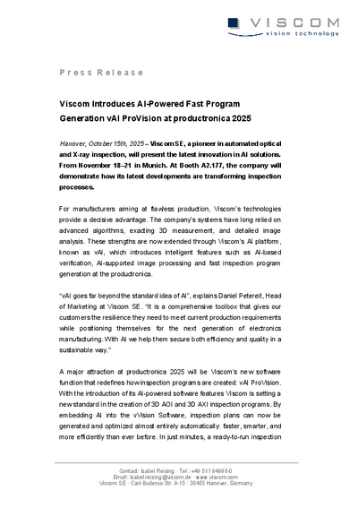A major attraction at productronica 2025 will be Viscom’s new software function that redefines how inspection programs are created: vAI ProVision. With the introduction of its AI-powered software features Viscom is setting a new standard in the creation of 3D AOI and 3D AXI inspection programs. By embedding AI into the vVision Software, inspection plans can now be generated and optimized almost entirely automatically: faster, smarter, and more efficiently than ever before. In just minutes, a ready-to-run inspection program is available, delivering maximum inspection depth, exceptional quality, and driving lasting improvements in production performance.