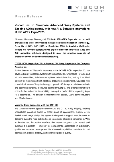 Hanover, Germany, February 18, 2025At IPC APEX Expo Viscom Inc. will showcase its latest innovations in high-resolution inspection technology. From March 18th - 20th, 2025, at Booth No. 2820, in Anaheim, California, visitors will have the opportunity to explore Viscom’s innovative X-ray and AOI inspection solutions designed to meet the growing demands of precision-driven electronics manufacturing.